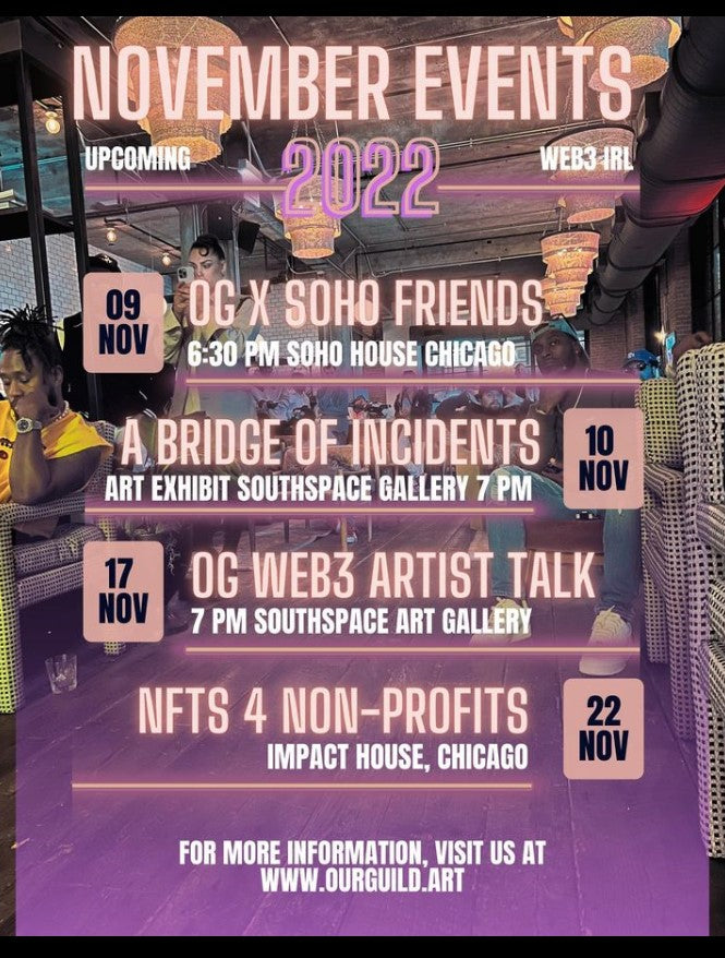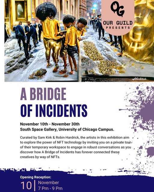 Curated by Sam Kirk & Robin Hardrick. The artists in this exhibition aim to explore the power of NFT technology by inviting you on a private tour of their temporary workspace to engage in robust conversations as you discover how A Bridge of Incidents has forever connected these creatives by way of NFTs.